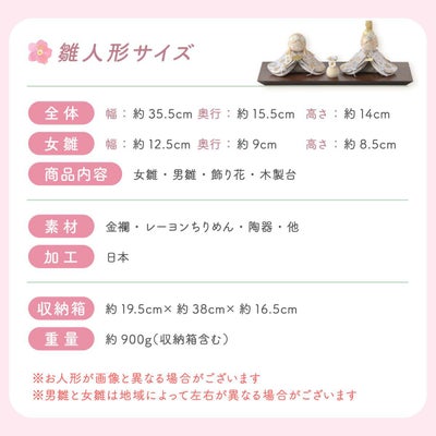 雛人形サイズ(cm):全体-幅35.5×奥行15.5×高さ14cm,女雛-幅約12.5/奥行9/高さ8.5