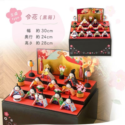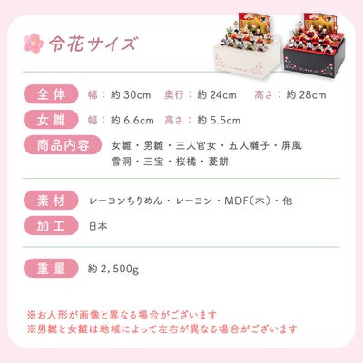雛人形サイズ(cm):令花-全体-幅約30/奥行24/高さ28・女雛-幅約6.6/高さ5.5