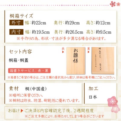 ※お人形に付属の保管箱は、厚手の紙製の箱となります。木製ではございません。ご了承くださいませ。