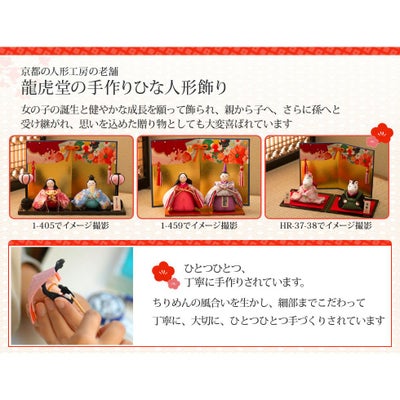 女の子が産まれての「初節句」は、嫁方の親が子供の身代わりとなって災いが降りかからない様に、という思いが込められ雛人形を贈ります。古の習わしと現代の雛祭りを融合し、お子さまのお部屋にお飾り頂く、季節を演出するインテリア、お店などのディスプレイや恋人への沢山の思いを込めたプレゼントなど多くのシーンで大活躍します。雄雛と雌雛のお召物はふわふわ感のちりめん細工のお着物をまとっています。 お人形・お道具は箱の中に収納できます。とってもコンパクトで収納上手なお雛さまです。ちりめんのお着物をまとった、お雛様とお内裏様、お顔の表情も相俟っておもわず「可愛い~~」って言ってしまう和みお雛様です。屏風や几帳などの小物もおひな様をより一層引き立てます。リュウコドウのお雛さまはちりめん細工の風合いをを生かし、細部にまで心をこめて丁寧に大切にひとつひとつ手づくりされています。お人形・お道具は箱の中に収納できます。とってもコンパクトで収納上手なお雛さまです。縮緬のお着物をまとった、お雛様とお内裏様、お顔の表情も相俟っておもわず可愛い~~って言ってしまう和みお雛様です。屏風や几帳などの小物もおひな様をより一層引き立てます。ボンボリ・桜橘・菱餅・花器もふわふわな縮緬細工で出来ており、ほっこり感を良く醸し出しています。 伝統の素材ちりめんはほっこり癒しの生地です。和んだ季節の雛祭りを演出してくれる事でしょう。初節句の贈り物に人気で、昔ながらのお雛様を怖がるお子さんなどには最適な雛人形飾りです。 素材を生かし細かいところにまでこだわって手づくりされていますので、非常に趣もございます。
