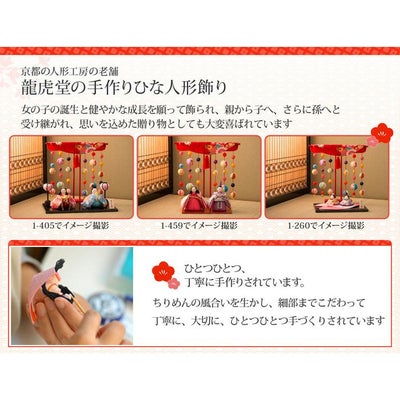 女の子が産まれての「初節句」は、嫁方の親が子供の身代わりとなって災いが降りかからない様に、という思いが込められ雛人形を贈ります。古の習わしと現代の雛祭りを融合し、お子さまのお部屋にお飾り頂く、季節を演出するインテリア、お店などのディスプレイや恋人への沢山の思いを込めたプレゼントなど多くのシーンで大活躍します。雄雛と雌雛のお召物はふわふわ感のちりめん細工のお着物をまとっています。 お人形・お道具は箱の中に収納できます。とってもコンパクトで収納上手なお雛さまです。ちりめんのお着物をまとった、お雛様とお内裏様、お顔の表情も相俟っておもわず「可愛い~~」って言ってしまう和みお雛様です。屏風や几帳などの小物もおひな様をより一層引き立てます。リュウコドウのお雛さまはちりめん細工の風合いをを生かし、細部にまで心をこめて丁寧に大切にひとつひとつ手づくりされています。お人形・お道具は箱の中に収納できます。とってもコンパクトで収納上手なお雛さまです。縮緬のお着物をまとった、お雛様とお内裏様、お顔の表情も相俟っておもわず可愛い~~って言ってしまう和みお雛様です。屏風や几帳などの小物もおひな様をより一層引き立てます。ボンボリ・桜橘・菱餅・花器もふわふわな縮緬細工で出来ており、ほっこり感を良く醸し出しています。 伝統の素材ちりめんはほっこり癒しの生地です。和んだ季節の雛祭りを演出してくれる事でしょう。初節句の贈り物に人気で、昔ながらのお雛様を怖がるお子さんなどには最適な雛人形飾りです。 素材を生かし細かいところにまでこだわって手づくりされていますので、非常に趣もございます。