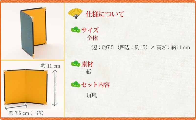 他の画像を見る 販売価格 ¥ 1,430 税込 カートに入れる お気に入りに登録する おしゃれなひな人形 省スペースで飾れる! 龍虎堂 雛人形 屏風 小道具 コンパクト かわいい 四曲金屏風15h リュウコドウ