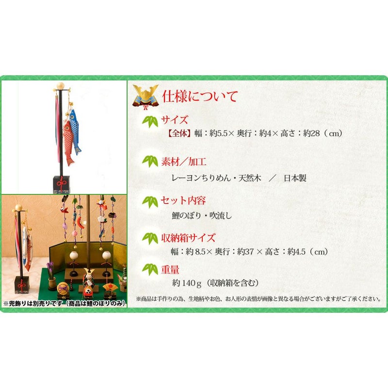 他の画像を見る 定価 ¥ 6,270 のところ 販売価格 ¥ 6,270 税込 カートに入れる お気に入りに登録する 送料無料 おしゃれでモダンな五月人形! 端午の節句を華やかに! 省スペースで飾れる 龍虎堂 五月人形 こいのぼり 室内鯉のぼり コンパクト かわいい スタンド染こいのぼり 室内鯉のぼり 吹流しセット ちりめん リュウコドウ