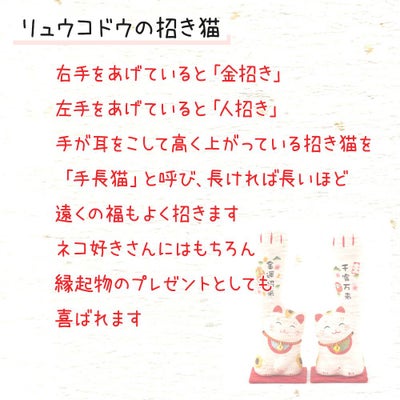 右は金招き、左は人招きと申し候(そうろう)。招き猫を玄関などに飾れば諸福をもたらすと言い伝え候。