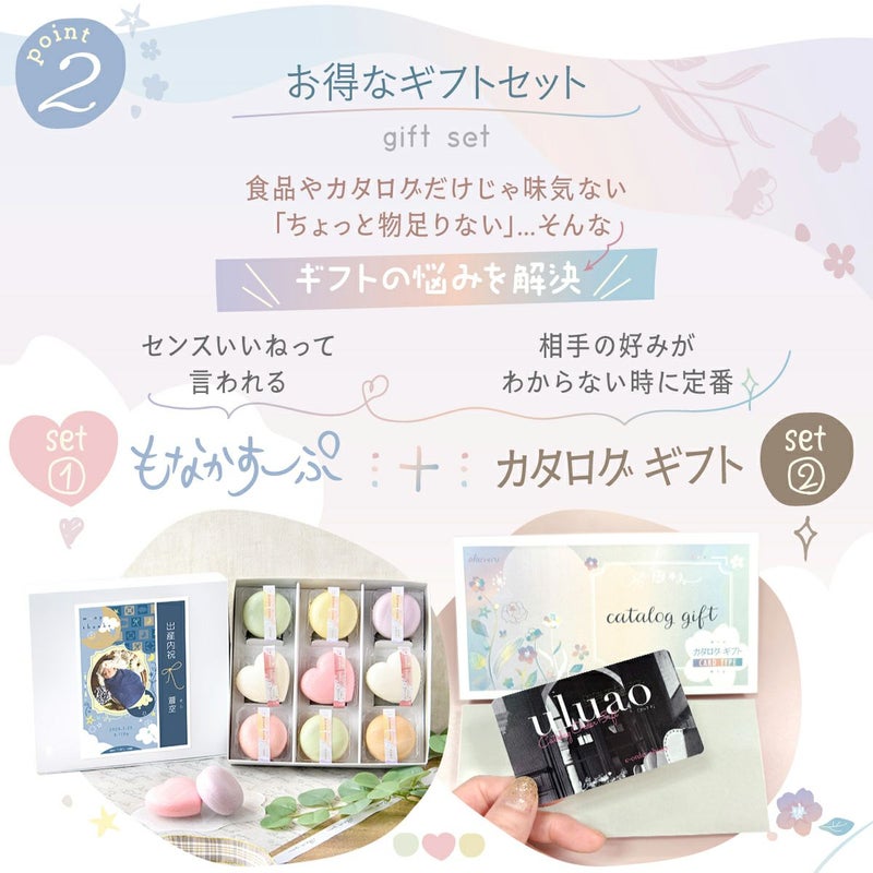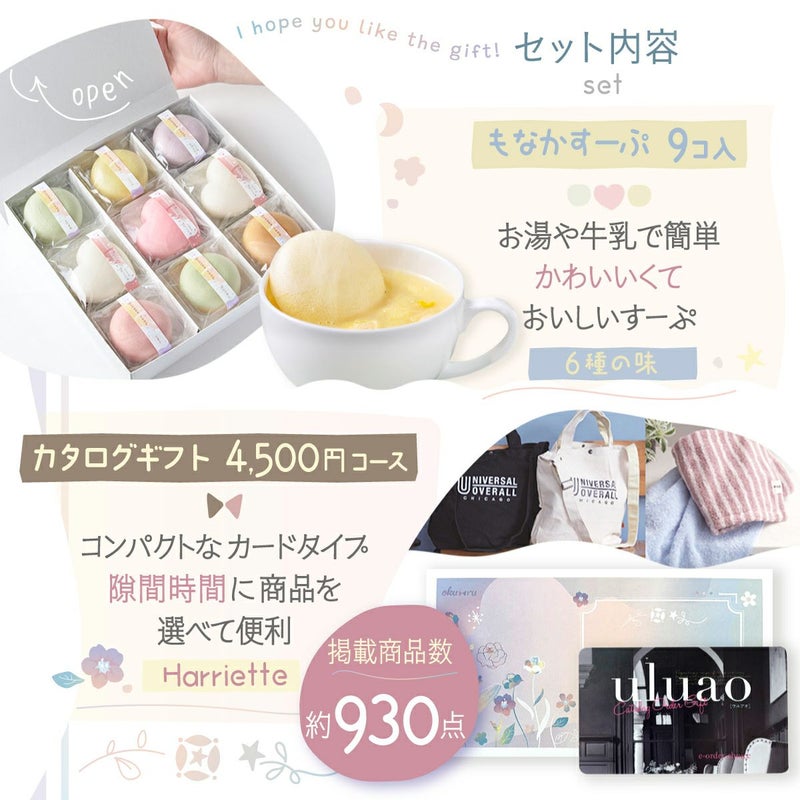 他の画像を見る マカロンみたいなスープのもなか 可愛い 贈って喜ばれる 【新商品】出産内祝い 結婚内祝い もなか スープ 最中スープ ギフト 味くらべ カタログギフトセット【uluao (ウルアオ) 】ハリエット 内祝い 送料無料 販売価格 ¥ 9,400 税込 詳細を見る お気に入りに登録する