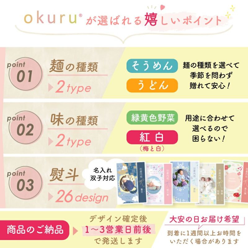 他の画像を見る 出産内祝いに大人気★各種内祝いや御祝におすすめ 名入れ ギフト 老舗池利の三輪そうめん 【新商品!!】出産内祝い 内祝い 出産 ギフト にゅうめん 三輪そうめん 三輪素麺 お湯かけにゅうめん 販売価格 ¥ 2,160 税込 〜 販売価格 ¥ 税込 詳細を見る お気に入りに登録する