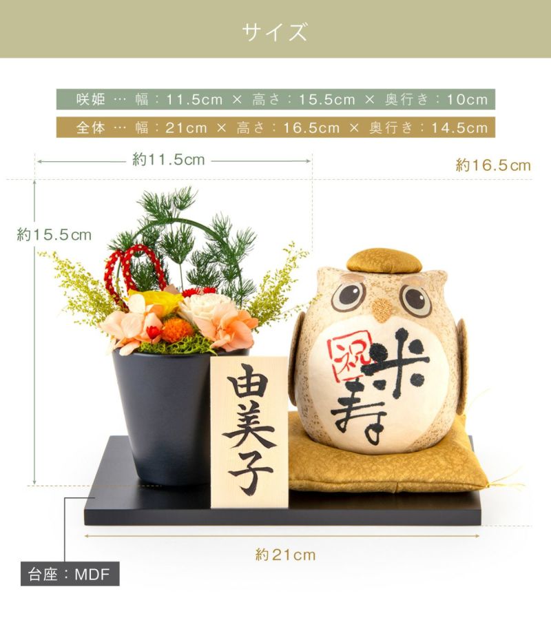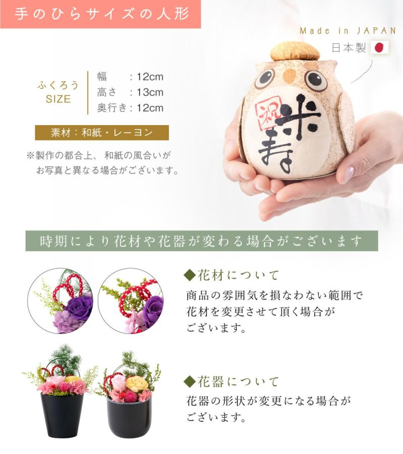 他の画像を見る 米寿や卒寿などのご長寿祝いに ふくろうとプリザーブドフラワー アレンジメント 当店オリジナル 福花セット 長寿祝ギフト 送料無料 販売価格 ¥ 8,999 税込 詳細を見る お気に入りに登録する