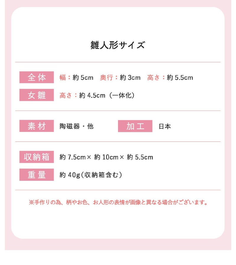 他の画像を見る 雛人形 コンパクト 雛人形 ひな人形 おひなさま お雛様 かわいい 桃の節句 初節句 ひなまつり コンパクト おしゃれ 玄関飾り 季節飾り プレゼント 孫贈り 雛人形 コンパクト モダン 新作 2026年 おしゃれ かわいい お雛様 ミニ サイズ ひな人形 親王飾り 錦彩睦ねこ雛 陶器 陶磁器 薬師窯 販売価格 ¥ 1,320 税込 カートに入れる お気に入りに登録する