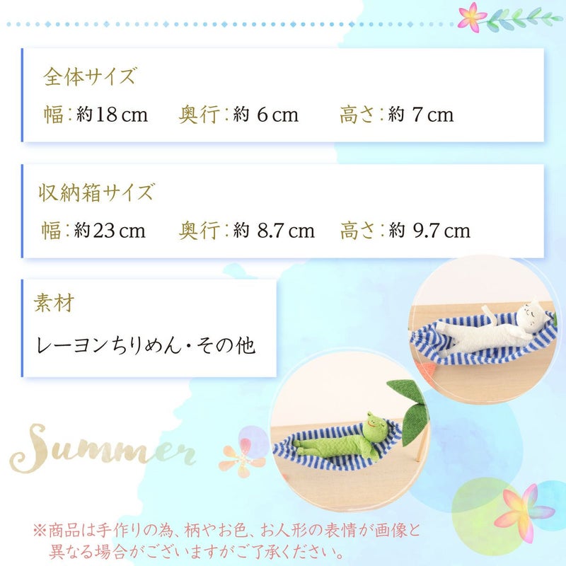 他の画像を見る 涼を感じる ハンモックにゆらゆら揺られて お飾り 和柄 ちりめん レーヨン 暑い夏 プレゼント インテリア置物 ちりめん レーヨン 暑い夏 プレゼント インテリア置物 【ゆらゆらバカンス】かえる ねこ 和雑貨 盛夏 リュウコドウ 販売価格 ¥ 1,760 税込 在庫切れ カートに入れる お気に入りに登録する