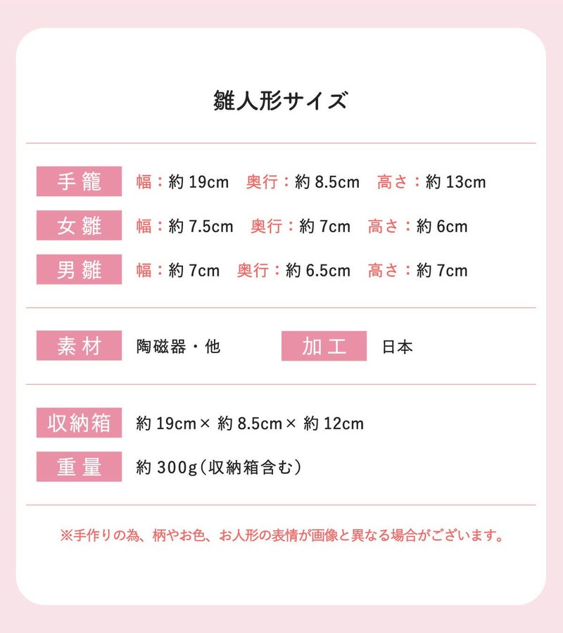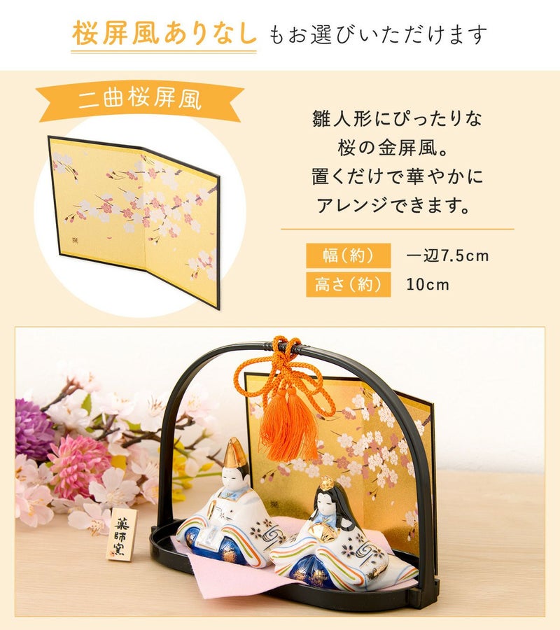 他の画像を見る おしゃれなひな人形 20cmスペースで飾れる! 雛人形 コンパクト かわいい 染錦手籠雛(大手籠付) 親王飾り 陶器 薬師窯 桐箱 桜屏風 ピンク毛氈付 販売価格 ¥ 3,630 税込 〜 販売価格 ¥ 税込 詳細を見る お気に入りに登録する