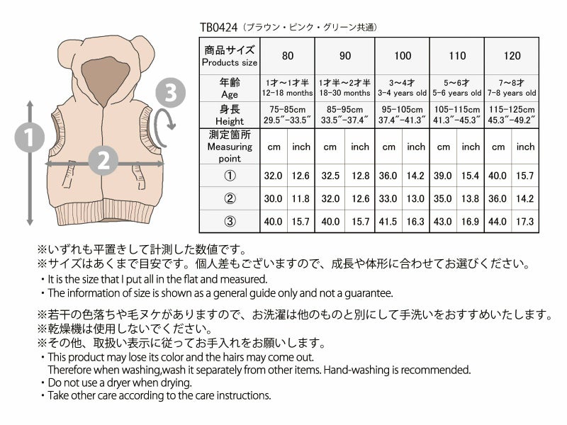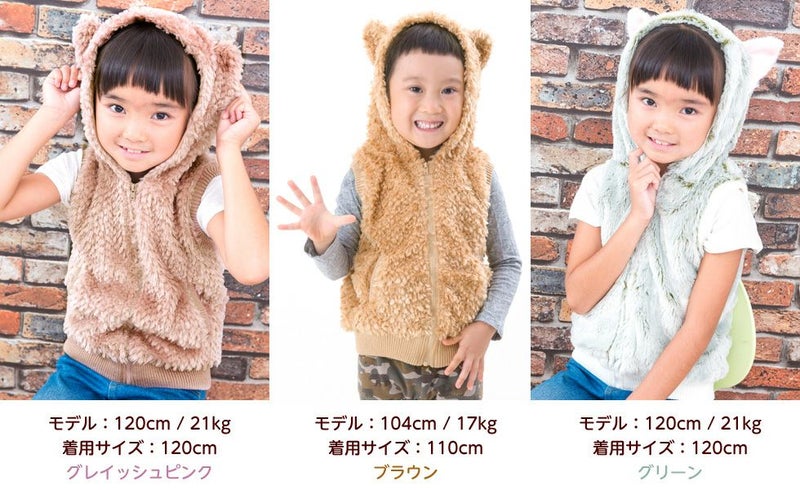 他の画像を見る ベビー キッズ 防寒着 くま ねこ 【もこもこベスト TB0424】 ブラウン グレイッシュピンク グリーン 男女共用 サイズ:80~120cm 送料無料 定価 ¥ 3,850 のところ 販売価格 ¥ 3,850 税込 カートに入れる お気に入りに登録する