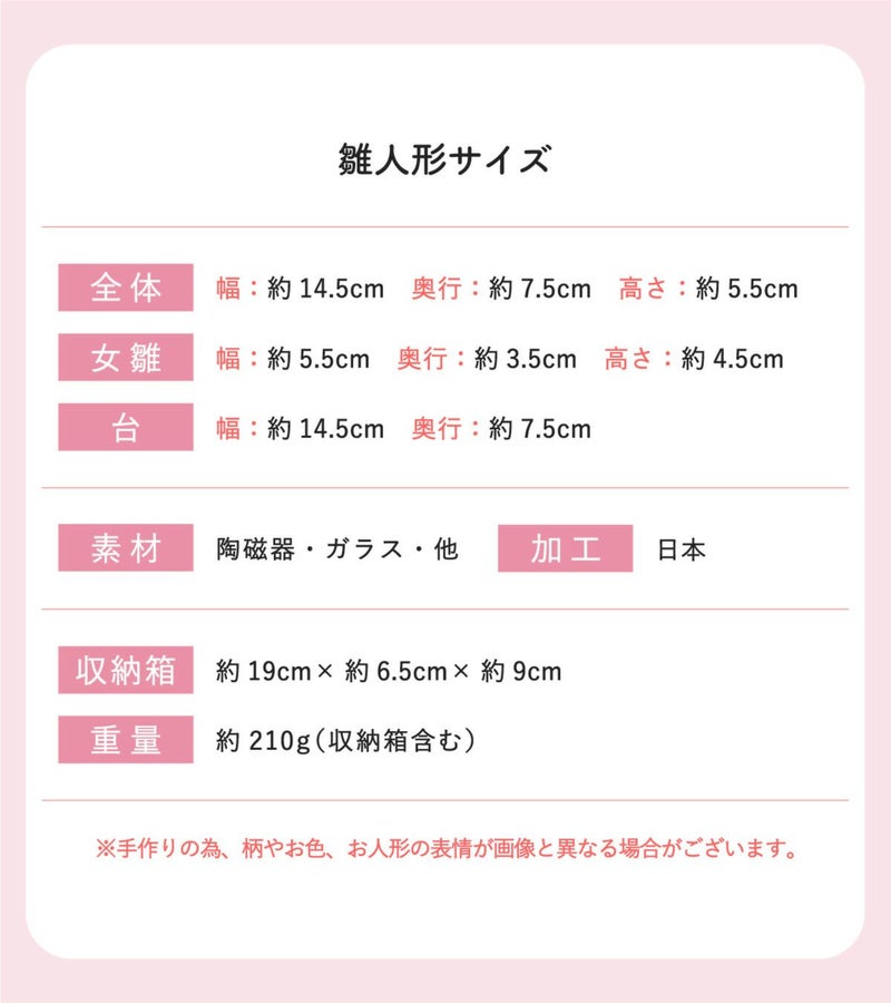 他の画像を見る 雛人形 コンパクト 雛人形 ひな人形 おひなさま お雛様 かわいい 桃の節句 初節句 ひなまつり 雛人形 コンパクト モダン 新作 2026年 おしゃれ かわいい お雛様 ミニ サイズ ひな人形 親王飾り 彩絵玻璃座雛(華の舞) 陶器 陶磁器 ガラス 桜屏風 販売価格 ¥ 3,850 税込 〜 販売価格 ¥ 税込 詳細を見る お気に入りに登録する