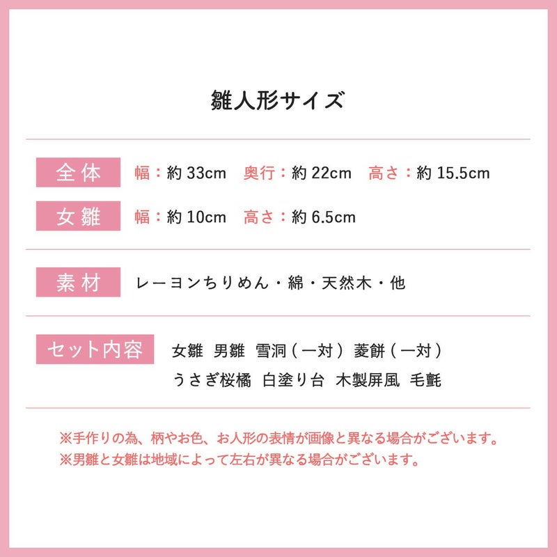 他の画像を見る おしゃれなひな人形 ちりめん 30cmスペースで飾れる! 龍虎堂 雛人形 コンパクト かわいい koti ぽんぽんうさぎ雛 親王飾り ケース飾り アクリルケース 桐箱 リュウコドウ 送料無料 10%OFFクーポン 販売価格 ¥ 26,400 税込 〜 販売価格 ¥ 税込 詳細を見る お気に入りに登録する